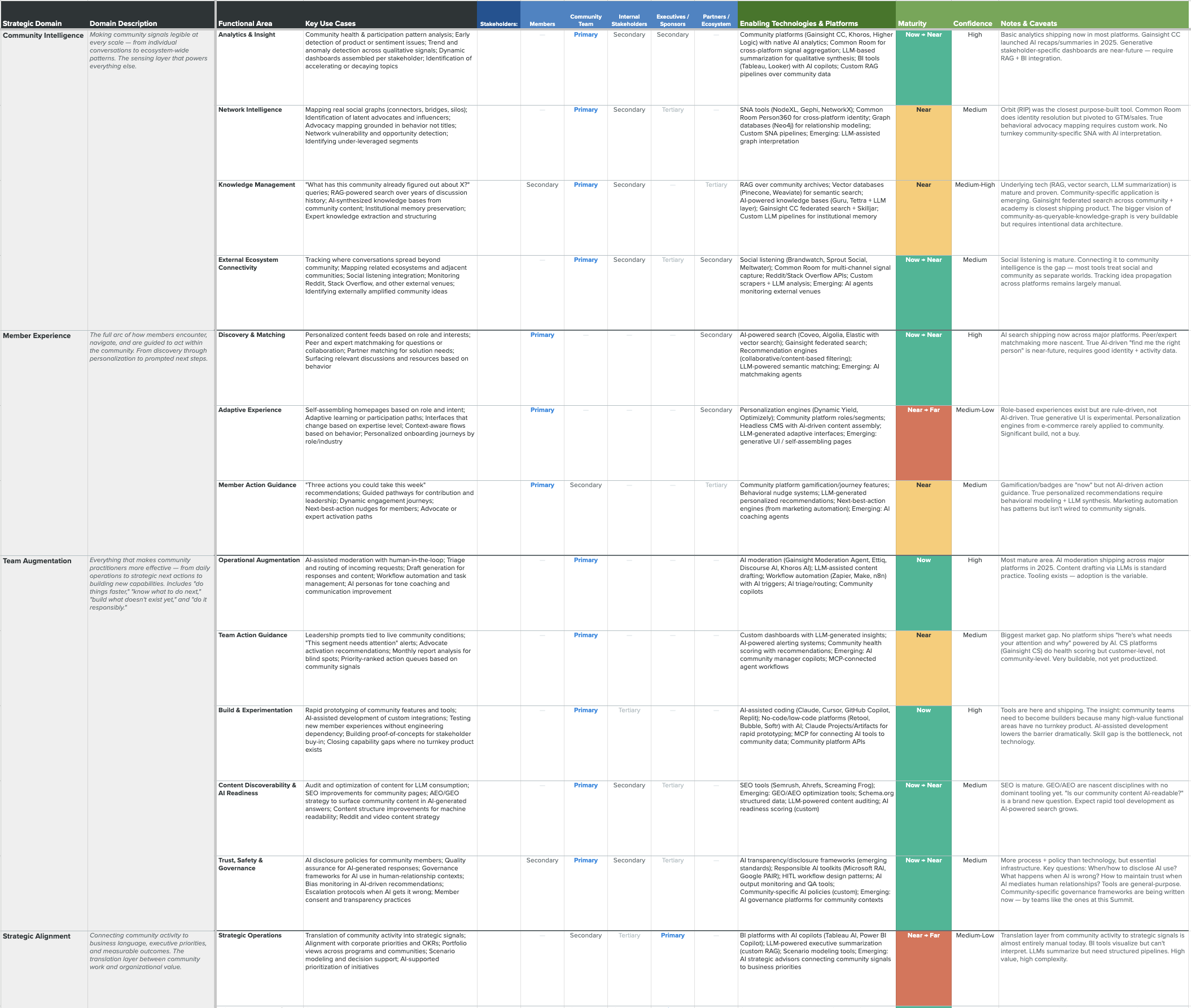 Most community teams are experimenting with AI in a few familiar areas: moderation, search, content drafting. The Community + AI Framework organizes the full range of opportunities into six strategic domains and sixteen functional areas, helping teams see the whole board and make deliberate choices about where to invest next.